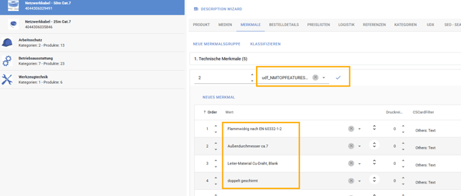 In nextPIM pflegen Sie in der Rubrik "MERKMALE" Eigenschaften, Vorteile und den Lieferumfang Ihrer Artikel an den Produkten, um diese Produktdaten für Ihren Webshop zu verwenden.