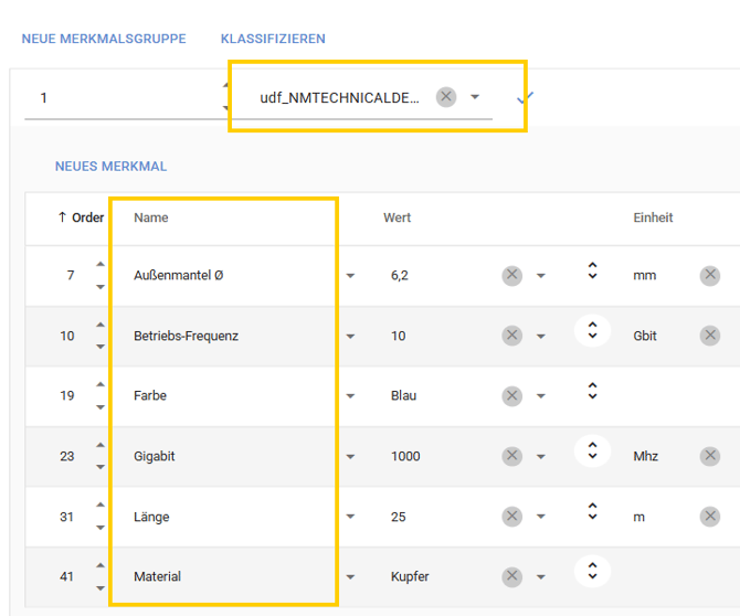 Dieses Merkmalssystem ermöglicht, neue Eigenschaften zusammen mit Wert und Einheit bei Produkten abzubilden.
