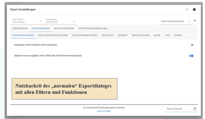 Der Intershop-Export kann auch über den Exportdialog gestartet werden. Dadurch lassen sich sämtliche Filter und Konfigurationen ebenfalls für den Intershop-Export nutzen.