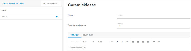 Legen Sie dann über den Button Neue Garantieklasse eine Garantieklasse an. Vergeben Sie einen Namen, eine Angabe bei "Garantie in Monaten" sowie bei Bedarf einen Beschreibungstext.
