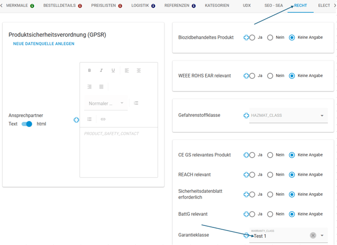 Gehen Sie in die Detailansicht eines Produktes, dem Sie eine Garantieklasse zuordnen möchten. Klicken Sie auf den Reiter Recht und wählen Sie in dem Drop-down-Menü neben dem Begriff Garantieklasse Ihre in Schritt 1 erstellte Garantieklasse aus. Alle angelegten Klassen werden Ihnen als Auswahloption angezeigt. Pro Produkt ist eine Zuordnung möglich.