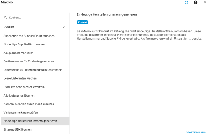 Dieses Makro sucht Produkte mit nicht eindeutigen Herstellerartikelnummern im Katalog. Diese Produkte bekommen eine neue eindeutige Herstellerartikelnummer.