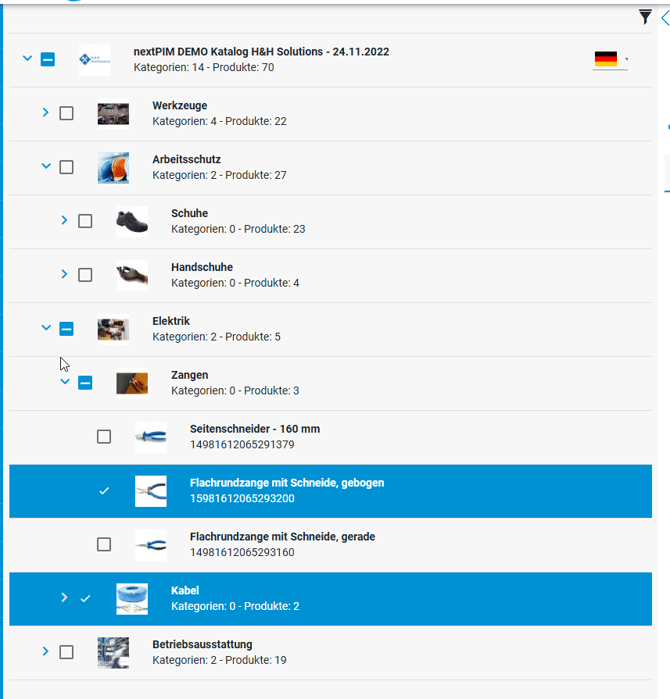 Zu Beginn der Massendatenänderung sind keine Artikel selektiert. Sie können jederzeit die Auswahl ändern und so die Artikel des gesamten Katalogs, einer oder mehrerer Kategorien oder nur eine bestimmte Auswahl an Artikeln überarbeiten.