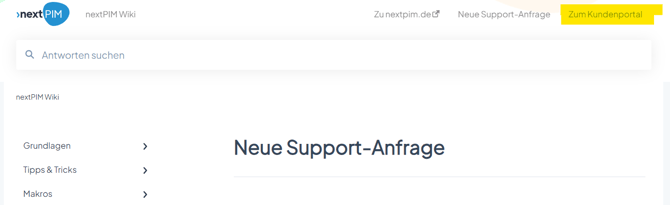 Zum nextPIM Kundenportal gelangen Sie mit Klick auf die Bezeichnung im oberen rechten Bildschirmrand.