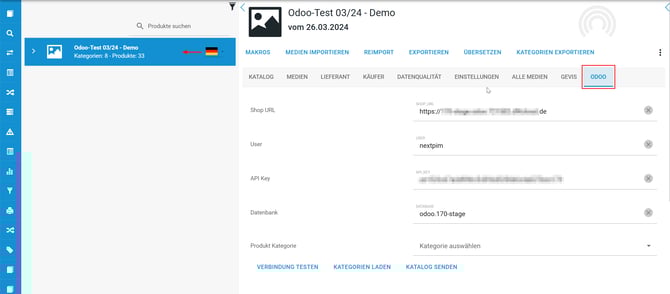 Nach der Installation des Addons erscheint in den Katalogeinstellungen ein neuer Reiter „Odoo“. Dort kann pro Katalog ein Zielsystem eingerichtet und konfiguriert werden. So ist es möglich, mehrere Odoo-Systeme anzusprechen wie zum Beispiel ein Test- und ein Echt-System.