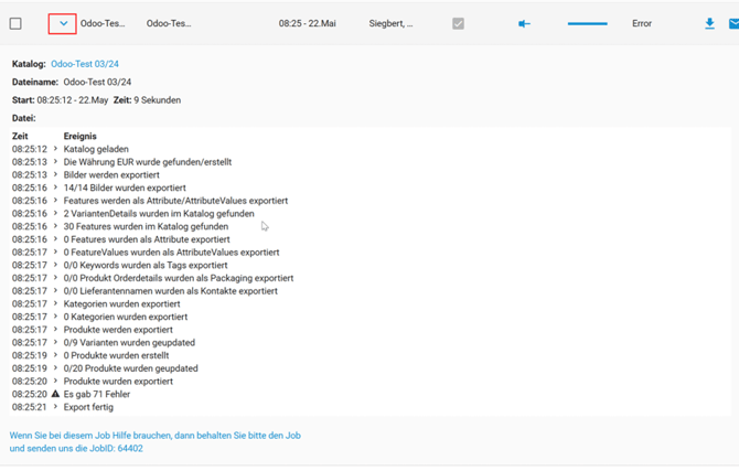 Ist der Job wie im obigen Screenshot bereits abgeschlossen, wird entweder die Status-Meldung Finish ausgegeben, oder, sofern Fehler auftraten, ein Error angezeigt mit der Möglichkeit, eine Fehlerliste herunterzuladen: