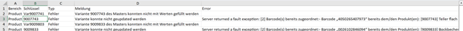 Die in der Fehlerliste enthaltenen Artikel konnten nicht übertragen werden. Sind die verursachenden Datenprobleme anhand der Liste behoben worden, kann eine erneute Übertragung gestartet werden.