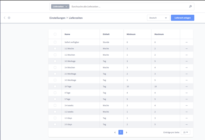 Die Schnittstelle durchsucht daraufhin die in Shopware unter Einstellungen > Shop > Lieferzeiten zu findende Tabelle.