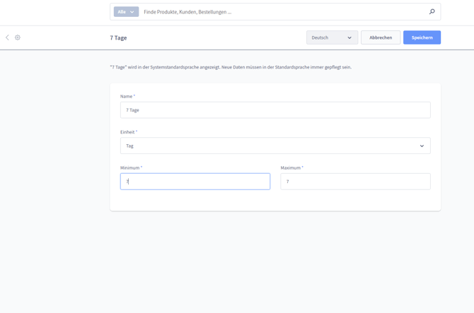 Hier können Sie die für das Produkt passende Lieferzeit eintragen (unser Beispiel "3 Tage").